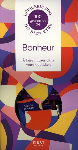 Utilisation Piochez, aussi souvent que vous en ressentez le besoin, un des livrets contenus dans cette boîte. Imprégnez-en soigneusement votre esprit. Laissez reposer 3 minutes. Respirez. Savourez l'effet. Ingrédients Le bonheur est dans la créativité - Les mots du bonheur - Petits défis pour être heureux - Heureux comme Montaigne - La déco du bonheur - La gourmandise, clé du bonheur - Le bonheur au travail - Une journée 100 % bonheur - Le bonheur de penser à soi - Le bonheur en partage - Le jardin de Voltaire - Les chansons du bonheur - Les films du bonheur - Les leçons de Bouddha - Les livres du bonheur - Les postures du bonheur - Petits bonheurs instantanés - Devises d'optimistes - Les outils du bonheur - Epicurisme, mode d'emploi.