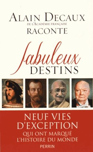 Neuf destins fabuleux figurent au sommaire de ce livre. Parmi eux, des hommes politiques qui ont marqué l'histoire : César Borgia, fils de pape et prince guerrier de la Renaissance ; «le lion» Winston Churchill, Premier Ministre du Royaume-Uni, et le Mahatma Gandhi, l'homme dont Nelson Mandela s'inspira. Mais aussi des parcours tragiques, comme celui des derniers Romanov. La mort mystérieuse de Louis Renault, ou encore l'étrange décès de Stavisky, l'histoire de l'organisation des cagoulards et celle de l'homme qui voulait empêcher la Seconde Guerre mondiale complètent ce fascinant tableau. Alain Decaux exploite ici une foule d'informations réunies pendant vingt ans, et dont il n'a utilisé qu'une partie dans ses célèbres émissions télévisées.