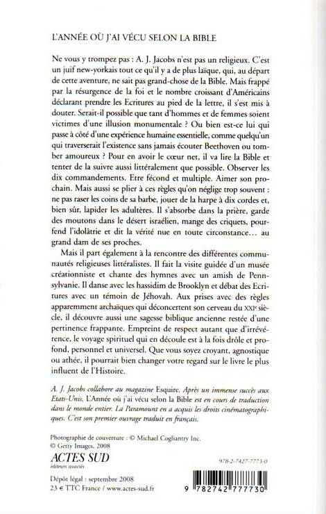 Ne vous y trompez pas : A. J. Jacobs n'est pas un religieux. C'est un juif new-yorkais tout ce qu'il y a de plus laïque, qui, au départ de cette aventure, ne sait pas grand-chose de la Bible. Mais frappé par la résurgence de la foi et le nombre croissant d'Américains déclarant prendre les Ecritures au pied de la lettre, il s'est mis à douter. Serait-il possible que tant d'hommes et de femmes soient victimes d'une illusion monumentale ? Ou bien est-ce lui qui passe à côté d'une expérience humaine essentielle, comme quelqu'un qui traverserait l'existence sans jamais écouter Beethoven ou tomber amoureux ? Pour en avoir le cœur net, il va lire la Bible et tenter de la suivre aussi littéralement que possible. Observer les dix commandements. Etre fécond et multiple. Aimer son prochain. Mais aussi se plier à ces règles qu'on néglige trop souvent : ne pas raser les coins de sa barbe, jouer de la harpe à dix cordes et, bien sûr, lapider les adultères. Il s'absorbe dans la prière, garde des moutons dans le désert israélien, mange des criquets, pourfend l'idolâtrie et dit la vérité nue en toute circonstance... au grand dam de ses proches. Mais il part également à la rencontre des différentes communautés religieuses littéralistes. Il fait la visite guidée d'un musée créationniste et chante des hymnes avec un amish de Pennsylvanie. Il danse avec les hassidim de Brooklyn et débat des Ecritures avec un témoin de Jéhovah. Aux prises avec des règles apparemment archaïques qui déconcertent son cerveau du XXIe siècle, il découvre aussi une sagesse biblique ancienne restée d'une pertinence frappante. Empreint de respect autant que d'irrévérence, le voyage spirituel qui en découle est à la fois drôle et profond, personnel et universel. Que vous soyez croyant, agnostique ou athée, il pourrait bien changer votre regard sur le livre le plus influent de l'Histoire.
