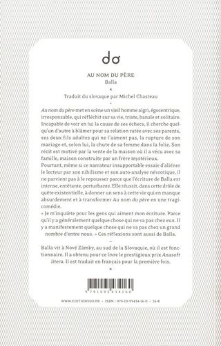 Au nom du Père met en scène un vieil homme aigri, égocentrique, qui réfléchit sur sa vie, triste et solitaire. Il cherche quelqu'un d'autre à blâmer pour sa relation ratée avec ses parents, ses deux fils adultes, la rupture de son mariage et la chute de sa femme dans la folie. Son récit est motivé par la vente de la maison où il a vécu avec sa famille, maison construite par un frère mystérieux. Et même si ce narrateur insupportable essaie d'aliéner le lecteur par son nihilisme et son auto-analyse névrotique, il ne parvient pas à le repousser parce que l'écriture est intense et perturbante. Dans cette quête existentielle, elle parvient à donner un sens à cette vie qui en manque absurdement et à transformer le texte en tragicomédie. "Je m'inquiète pour les gens qui aiment mon écriture. Parce qu'il y a généralement quelque chose qui ne va pas chez eux. Il y a manifestement quelque chose qui ne va pas chez un grand nombre d'entre nous". Ces réflexions sont aussi de Balla.