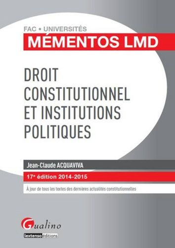 Matière essentielle pour les étudiants en 1e année de licence en droit, le droit constitutionnel a pour but d'encadrer le pouvoir de l'Etat afin qu'il n'étouffe pas les libertés des individus ; il vise à organiser, dans le cadre de l'Etat, une coexistence pacifique du pouvoir et de la liberté. Quant aux institutions politiques, il s'agit des partis et des associations liés au pouvoir ou qui font pression sur lui. Si elles ne rentrent pas toujours dans le cadre du droit constitutionnel, leur étude permet de comprendre bien des mécanismes et des réalités. Leur étude complète celle du droit constitutionnel. Cette nouvelle édition 2014-2015 est une synthèse claire, structurée et accessible du Droit constitutionnel et des Institutions politiques en France.
