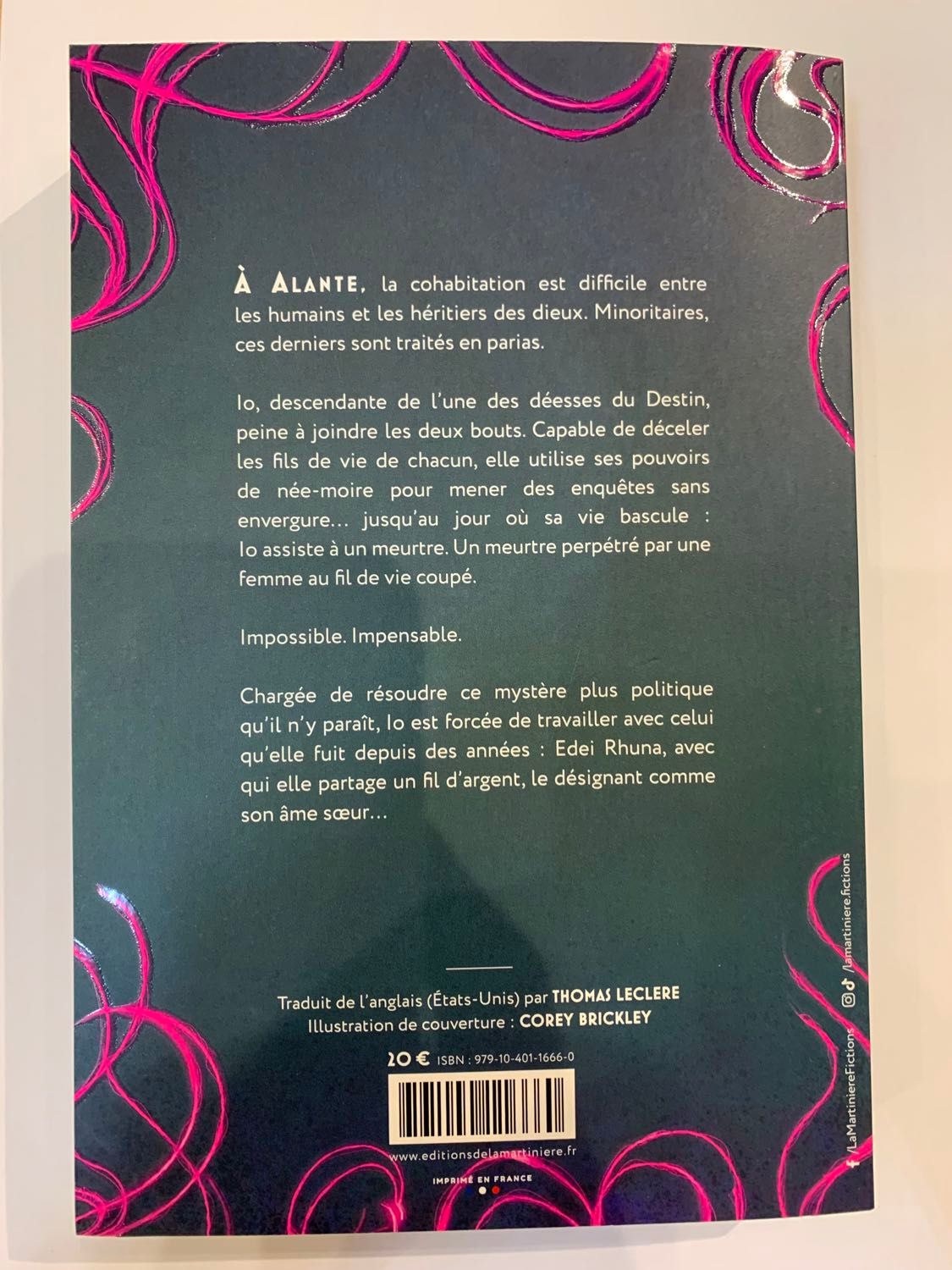 A Alante, la cohabitation est difficile entre les humains et les héritiers des dieux. Minoritaires, ces derniers sont traités en parias. Io, descendante de l'une des déesses du Destin, peine à joindre les deux bouts. Capable de déceler les fils de vie de chacun, elle utilise ses pouvoirs de née-moire pour mener des enquêtes sans envergure... jusqu'au jour où sa vie bascule : Io assiste à un meurtre. Un meurtre perpétré par une femme au fil de vie coupé. Impossible. Impensable. Chargée de résoudre ce mystère plus politique qu'il n'y paraît, Io est forcée de travailler avec celui qu'elle fuit depuis des années : Edei Rhuna, avec qui elle partage un fil d'argent, le désignant comme son âme soeur...