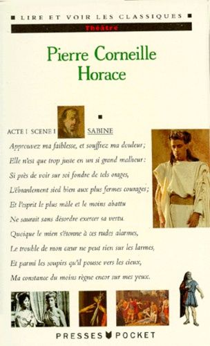On se plut au XVIè et au XVIIIè à voir en Corneille le dernier Romain, lui qui puisa le sujet d'une quinzaine de tragédies dans la longue histoire de Rome. Apologie monarchiste, " Horace " accorde le triomphe à un roi puissant et juste : c'est Louis XIII qui acquitte le héros meurtrier. Le dossier historique et littéraire est tout entier consacré aux origines légendaires de Rome sans oublier de faire une place de choix au peintre David et à son célèbre "Serment des Horaces".