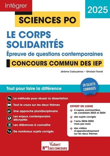 Tout ce que vous devez savoir pour réussir l'épreuve de questions contemporaines du concours commun des IEP 2025 ! Epreuve emblématique du concours commun des instituts d'études politiques (IEP), les questions contemporaines mobilisent des savoirs variés, notamment issus de la philosophie, de l'histoire, de la géographie ou encore des sciences économiques et sociales. Une bonne connaissance de l'actualité et des débats qui agitent notre société est indispensable pour discuter, étayer et mettre en perspective les arguments. Pour répondre à ces exigences, ce livre propose : - une méthode pas à pas pour réussir sa dissertation ; - un cours sur les deux thèmes au programme ; - une approche pluridisciplinaire ; - un décryptage de tous les enjeux contemporains ; - 100 textes clés, fiches de lecture et citations à connaître ; - 15 sujets corrigés ; - 3 copies d'élèves commentées ; + OFFERT en ligne : - Vidéos "Focus" pour aller plus loin sur des points spécifiques du cours - 5 sujets corrigés supplémentaires pour poursuivre l'entraînement - un fil d'actualité 2024-2025 mois par mois pour rester informé - des synthèses audio du cours pour réviser autrement.