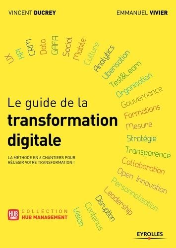Face à la disruption causée par le numérique, la transformation digitale est devenue un sujet majeur de préoccupation et un enjeu stratégique pour toutes les organisations quelle que soit leur taille : business, marketing, ressources humaines, processus de production, système d'informations, datas... C'est pour répondre à ce défi que Vincent Ducrey et Emmanuel Vivier ont écrit Le Guide de la transformation digitale. Après plus de quinze ans à accompagner les grandes entreprises et organisations dans le numérique, ils présentent une méthode pédagogique et solide en six chantiers et cinq étapes pour penser et réussir la transformation digitale de votre organisation. Que vous soyez un dirigeant, un directeur marketing, un DSI, un directeur digital, un manager ou un collaborateur qui veut comprendre et maîtriser les enjeux stratégiques à venir, cet ouvrage a été pensé pour vous. L'ouvrage de référence pour : comprendre les causes de la disruption liée au digital (techno, start-ups, GAFA...) ; découvrir les 14 tendances technologiques qui changent le monde ; maîtriser les 6 chantiers clés de la transformation digitale (management, RH, technologie, data, marketing, mesure de la performance) ; définir et établir une feuille de route en 5 étapes pour votre transformation ; identifier les grandes erreurs à éviter ; découvrir les questions clés à vous poser à chaque étape de votre transformation ; comprendre les recettes du succès d'une vingtaine de grands décideurs ; apprendre concrètement ce qui se cache derrière le jargon du digital ; rendre votre structure et vos équipes plus agiles ; savoir mesurer la performance de vos actions et campagnes. Inclus : 4 grandes ruptures et 14 tendances technologiques qui changent le monde ; 100 start-ups qui vont disrupter les industries traditionnelles ; 6 chantiers clés pour réussir votre transformation digitale ; 5 étapes pour définir votre feuille de route ; 30 questions à vous poser pour appliquer ces conseils à votre organisation ; 22 témoignages de décideurs du digital et 22 avis d'experts ; 101 mots pour tout comprendre,1 accès aux bonus (interviews, schémas, bonnes pratiques) sur le site du livre.
