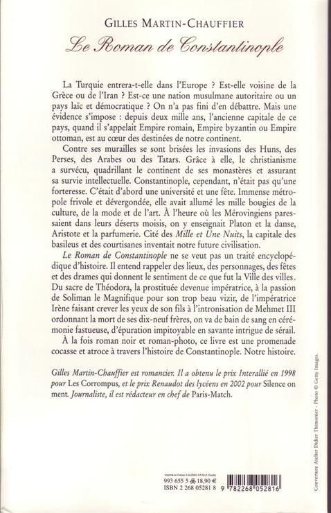 La Turquie entrera-t-elle dans l'Europe ? Est-elle voisine de la Grèce ou de l'Iran ? Est-ce une nation musulmane autoritaire ou un pays laïc et démocratique ? On n'a pas fini d'en débattre. Mais une évidence s'impose : depuis deux mille ans, l'ancienne capitale de ce pays, quand il s'appelait Empire romain, Empire byzantin ou Empire ottoman, est au cœur des destinées de notre continent. Contre ses murailles se sont brisées les invasions des Huns, des Perses, des Arabes ou des Tatars. Grâce à elle, le christianisme a survécu, quadrillant le continent de ses monastères et assurant sa survie intellectuelle. Constantinople, cependant, n'était pas qu'une forteresse. C'était d'abord une université et une fête. Immense métropole frivole et dévergondée, elle avait allumé les mille bougies de la culture, de la mode et de l'art. A l'heure où les Mérovingiens paressaient dans leurs déserts moisis, on y enseignait Platon et la danse, Aristote et la parfumerie. Cité des Mille et Une Nuits, la capitale des basileus et des courtisanes inventait notre future civilisation. Le Roman de Constantinople ne se veut pas un traité encyclopédique d'histoire. Il entend rappeler des lieux, des personnages, des fêtes et des drames qui donnent le sentiment de ce que fut la Ville des villes. Du sacre de Théodora, la prostituée devenue impératrice, à la passion de Soliman le Magnifique pour son trop beau vizir, de l'impératrice Irène faisant crever les yeux de son fils à l'intronisation de Mehmet III ordonnant la mort de ses dix-neuf frères, on va de bain de sang en cérémonie fastueuse, d'épuration impitoyable en savante intrigue de sérail. A la fois roman noir et roman-photo, ce livre est une promenade cocasse et atroce à travers l'histoire de Constantinople. Notre histoire.