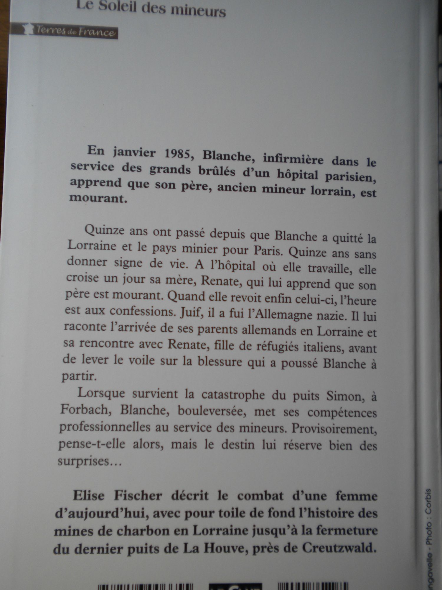 En janvier 1985, Blanche, infirmière dans le service des grands brûlés d'un hôpital parisien, apprend que son père, ancien mineur lorrain, est mourant. Quinze ans ont passé depuis que Blanche a quitté la Lorraine et le pays minier pour Paris. Quinze ans sans donner signe de vie. A l'hôpital où elle travaille, elle croise un jour sa mère, Renate, qui lui apprend que son père est mourant. Quand elle revoit enfin celui-ci, l'heure est aux confessions. Juif, il a fui l'Allemagne nazie. Il lui raconte l'arrivée de ses parents allemands en Lorraine et sa rencontre avec Renate, fille de réfugiés italiens, avant de lever le voile sur la blessure qui a poussé Blanche à partir. Lorsque survient la catastrophe du puits Simon, à Forbach, Blanche, bouleversée, met ses compétences professionnelles au service des mineurs. Provisoirement, pense-t-elle alors, mais le destin lui réserve bien des surprises... Elise Fischer décrit le combat d'une femme d'aujourd'hui, avec pour toile de fond l'histoire des mines de charbon en Lorraine jusqu'à là fermeture du dernier puits de La Houve, près de Creutzwald.