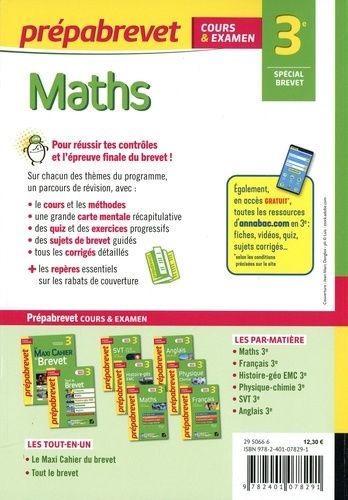 Un outil de travail complet et efficace, conforme au programme de Maths 3e. De nombreuses ressources - fiches de cours, méthodes clés, exercices progressifs, sujets de brevet -, pour t'accompagner tout au long de ta 3e et faciliter ta réussite à l'examen. Sur chaque thème du programme - Des fiches de cours synthétiques et visuelles - Les méthodes et savoir-faire clés - Une grande carte mentale récapitulative - Des exercices progressifs et des sujets de brevet guidés - Tous les corrigés détaillés Dans un cahier " Spécial brevet " - Des brevets blancs pour se mettre dans les conditions de l'épreuve de Maths - Des corrigés conformes aux exigences des correcteurs En accès gratuit, avec l'achat du livre, sur le site - Des parcours de révision interactifs - fiches, quiz et sujets corrigés - sur chaque thème du programme - Des conseils pour bien s'orienter