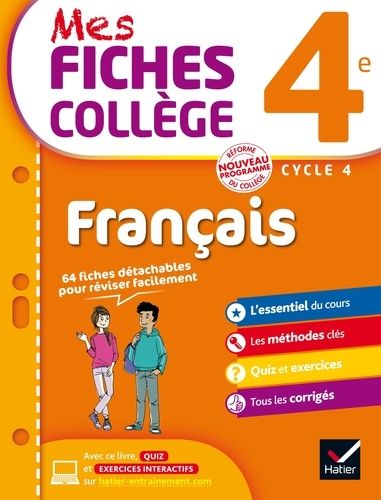 Toutes les compétences du nouveau programme de français 4e présentées sous forme de fiches claires et visuelles, pour revoir son programme et s'entraîner de manière efficace. Votre enfant a besoin de revoir un point particulier du programme de français 4e ? Il le retrouve dans le sommaire des 64 fiches et peut, grâce à la fiche-outil correspondante : revoir juste ce qu'il faut du cours ("L'essentiel") ; s'approprier un savoir-faire de base ("Mettre en pratique") ; s'entraîner avec un exercice type ("A ton tour !). En cas de contrôle, il peut : revoir les fiches outils correspondantes ; s'évaluer rapidement avec la fiche "Quiz express" ; se mettre en condition grâce à la fiche "Contrôle continu". Tous les exercices proposés font l'objet d'un corrigé détaillé à la fin de l'ouvrage. Avec des exercices interactifs en ligne. L'achat de l'ouvrage permet d'accéder gratuitement au site d'entrainement et aux exercices interactifs proposés en complément dans la rubrique "Mes fiches collège".