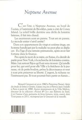 C'est l'été, à Neptune Avenue, au bord de l'océan, à l'extrémité de Brooklyn, juste à côté de Coney Island. Le soleil brille derrière une drôle de lumière laiteuse, il fait très chaud. Les ascenseurs sont en panne. Tout est en panne. Le monde entier s'est-il arrêté? Dans son appartement du vingt et unième étage, un homme handicapé par la maladie ne peut plus se déplacer. Il a l'âge d'une retraite prématurée, après avoir fait fortune dans la finance. Peu après la mort de sa mère, en Suisse, il a décidé de partir pour New York, à la recherche de lointains cousins. Mais c'est surtout Bijou qu'il est venu trouver. Qu'est-elle pour lui, qui est-il pour elle ? Elle a la fraîcheur de la jeunesse, vit de petits boulots, prône la décroissance et veut à tout prix préserver sa liberté. L'argent, la richesse ne l'intéressent pas. Et tout pourrait bien partir en fumée...
