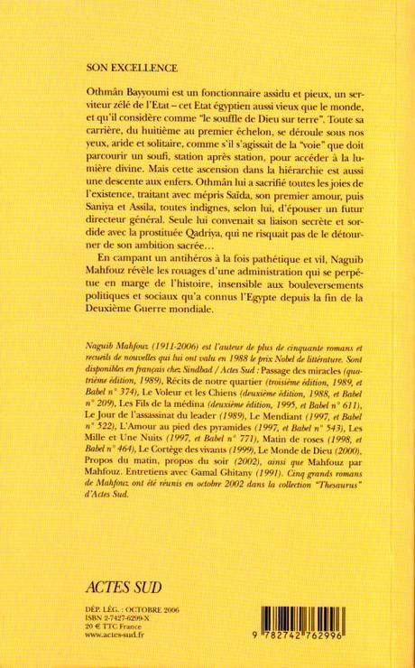 Othmân Bayyoumi est un fonctionnaire assidu et pieux, un serviteur zélé de l'Etat- cet Etat égyptien aussi vieux que le monde, et qu'il considère comme " le souffle de Dieu sur terre ". Toute sa carrière, du huitième au premier échelon, se déroule sous nos yeux, aride et solitaire, comme s'il s'agissait de la " voie " que doit parcourir un soufi, station après station, pour accéder à la lumière divine. Mais cette ascension dans la hiérarchie est aussi une descente aux enfers. Othmân lui a sacrifié toutes les joies de l'existence, traitant avec mépris Saïda, son premier amour, puis Saniya et Assila, toutes indignes, selon lui, d'épouser un futur directeur général. Seule lui convenait sa liaison secrète et sordide avec la prostituée Qadriya, qui ne risquait pas de le détourner de son ambition sacrée... En campant un antihéros à la fois pathétique et vil, Naguib Mahfouz révèle les rouages d'une administration qui se perpétue en marge de l'histoire, insensible aux bouleversements politiques et sociaux qu'a connus l'Egypte depuis la fin de la Deuxième Guerre mondiale.