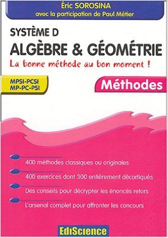 Ingrédients (pour 1 personne) : 400 méthodes, 400 exercices, un bouquet de remarques pertinentes, une bonne dose d'astuce, une pincée d'humour. Temps de préparation : deux ans (sup et spé). La recette du succès tient en trois mots : " de la méthode " ! Descartes lui-même, dont nul ne doute qu'il fut un homme de sciences éclairé, nous l'enseigne depuis des siècles. Mais attention : s'il est entendu que maîtriser une méthode est un atout majeur pour atteindre un objectif précis, encore faut-il faire preuve de la plus grande vigilance quant aux sempiternelles " recettes miracles " que d'aucuns ne manquent pas de promouvoir à tour de bras. Aussi, pour faire face à toute situation, un équipement de survie approprié est à votre disposition : notations, définitions et autres théorèmes essentiels sont rappelés et illustrés avec précision. En outre des remarques acérées, des astuces savoureuses et de petits secrets bien utiles vous aideront à décrypter les pièges, La série système D s'adresse exclusivement aux plus futés (ou à ceux qui veulent le devenir) des classes préparatoires scientifiques et des candidats aux concours de recrutement des professeurs, pour lesquels elle constituera une source d'idées intarissable. Pour les autres, qu'ils soient assurés de notre compassion...