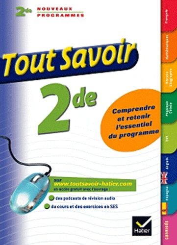 Pour réussir sa 2de, toutes les matières en un seul ouvrage :Français, mathématiques, histoire-géographie, physique-chimie, sciences de la vie et de la terre, anglais, espagnol.Sur chaque thème du programme :- un résumé du cours pour retenir l'essentiel,- une application pour assimiler la méthode,- une série d'exercices pour s'entraîner.Dans un onglet séparé :les corrigés détaillés de tous les exercices.Et sur site www.toutsavoir-hatier.comEn accès gratuit avec ce livre :- des podcasts pour mieux mémoriser le cours,- des exercices audio en anglais et en espagnol, pour s'entraîner à l'oral,- des outils de révision en SES.